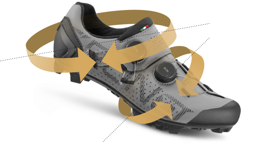 Multi Contact Closure System: doble cierre BOA® Li2 que trabaja en sinergia, distribuyendo la presión en dos vectores: uno entre el tobillo y el arco, y otro que ajusta el empeine hacia el talón. El pie permanece perfectamente sujeto, incluso en máximos esfuerzos.